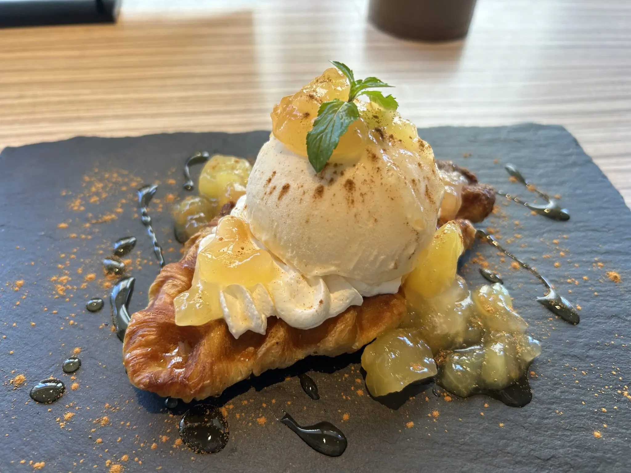 クロワッサン生地をワッフルメーカーで焼いた新感覚スイーツクロッフル。メープルとシナモン風味のりんごジャムが美味しい。