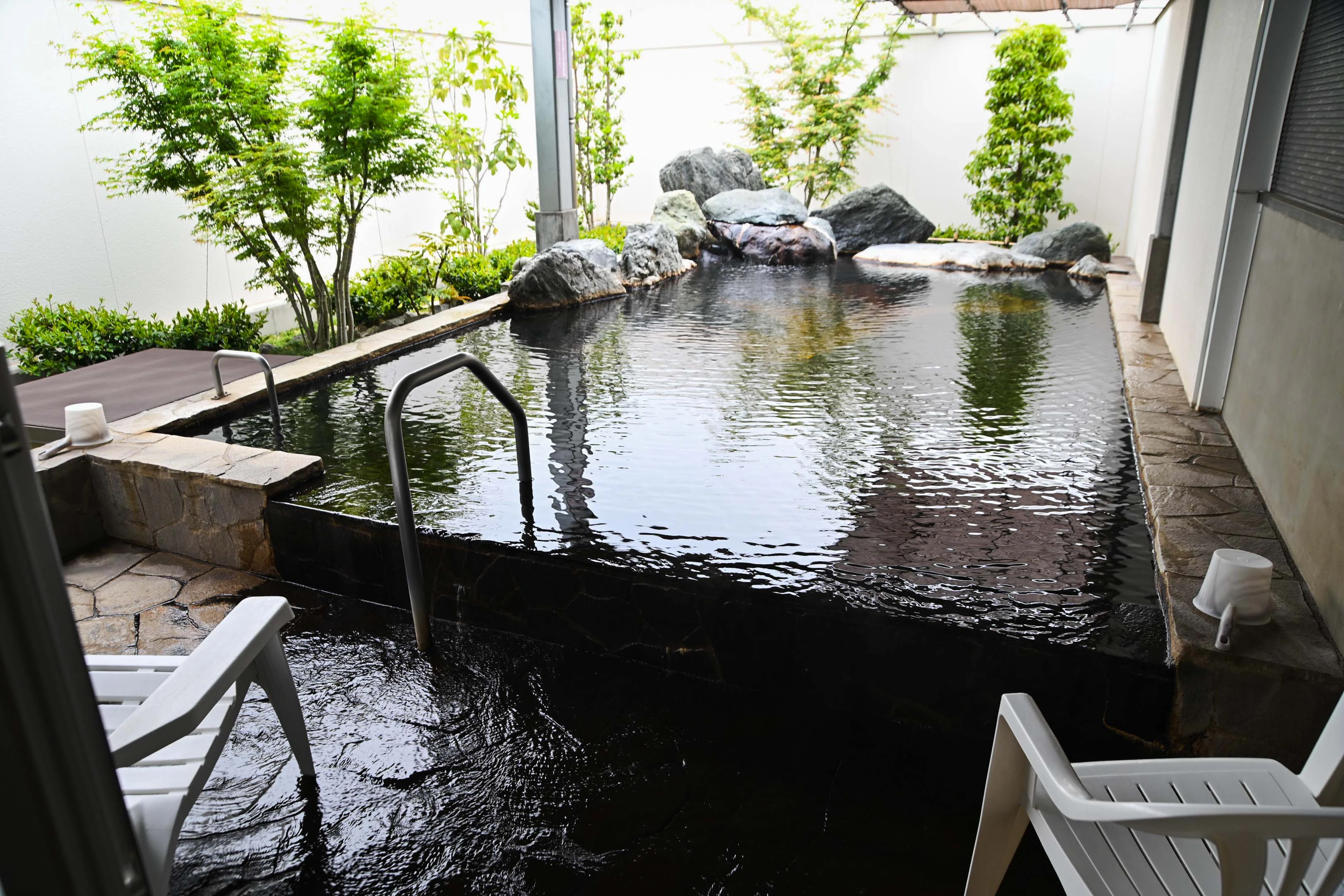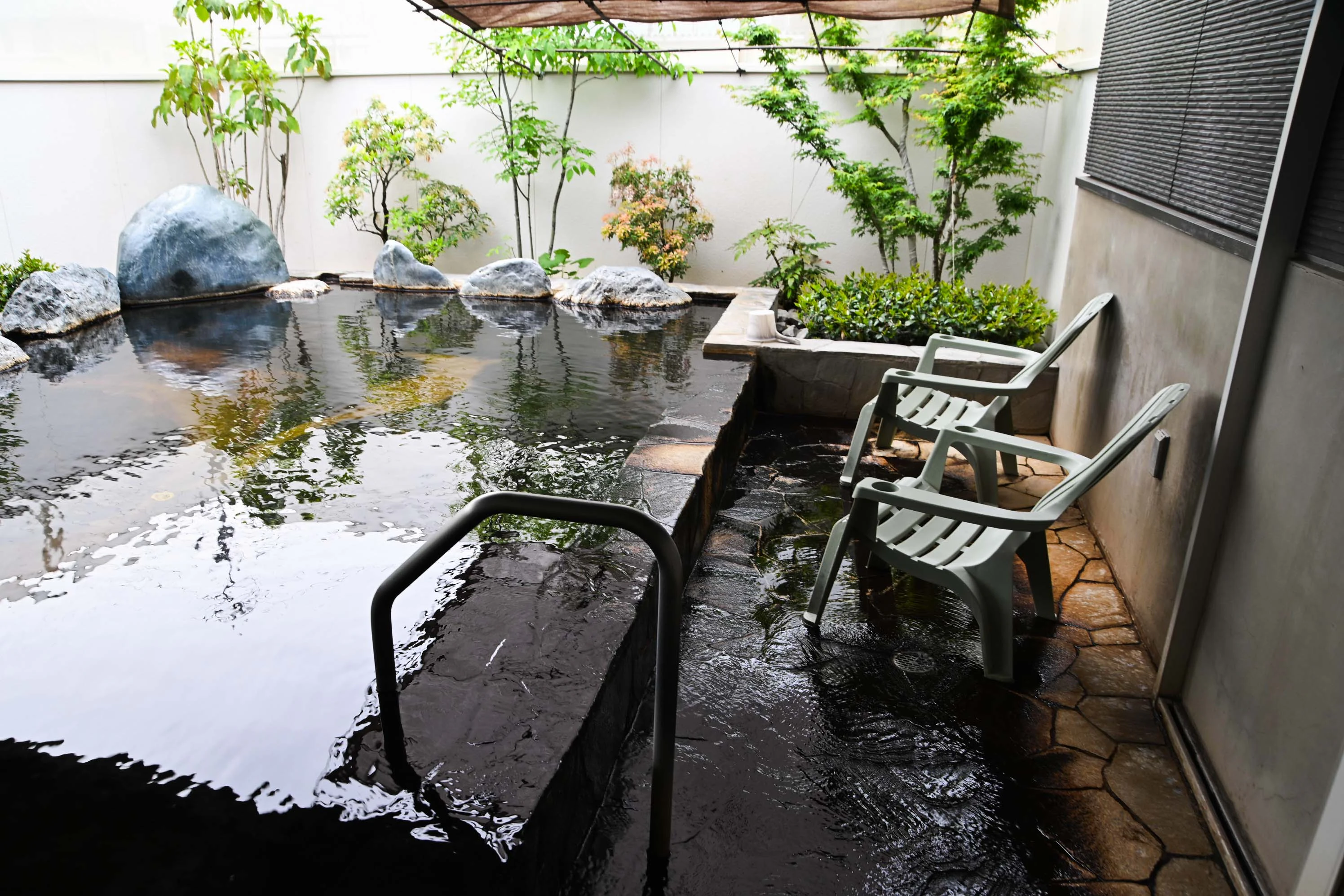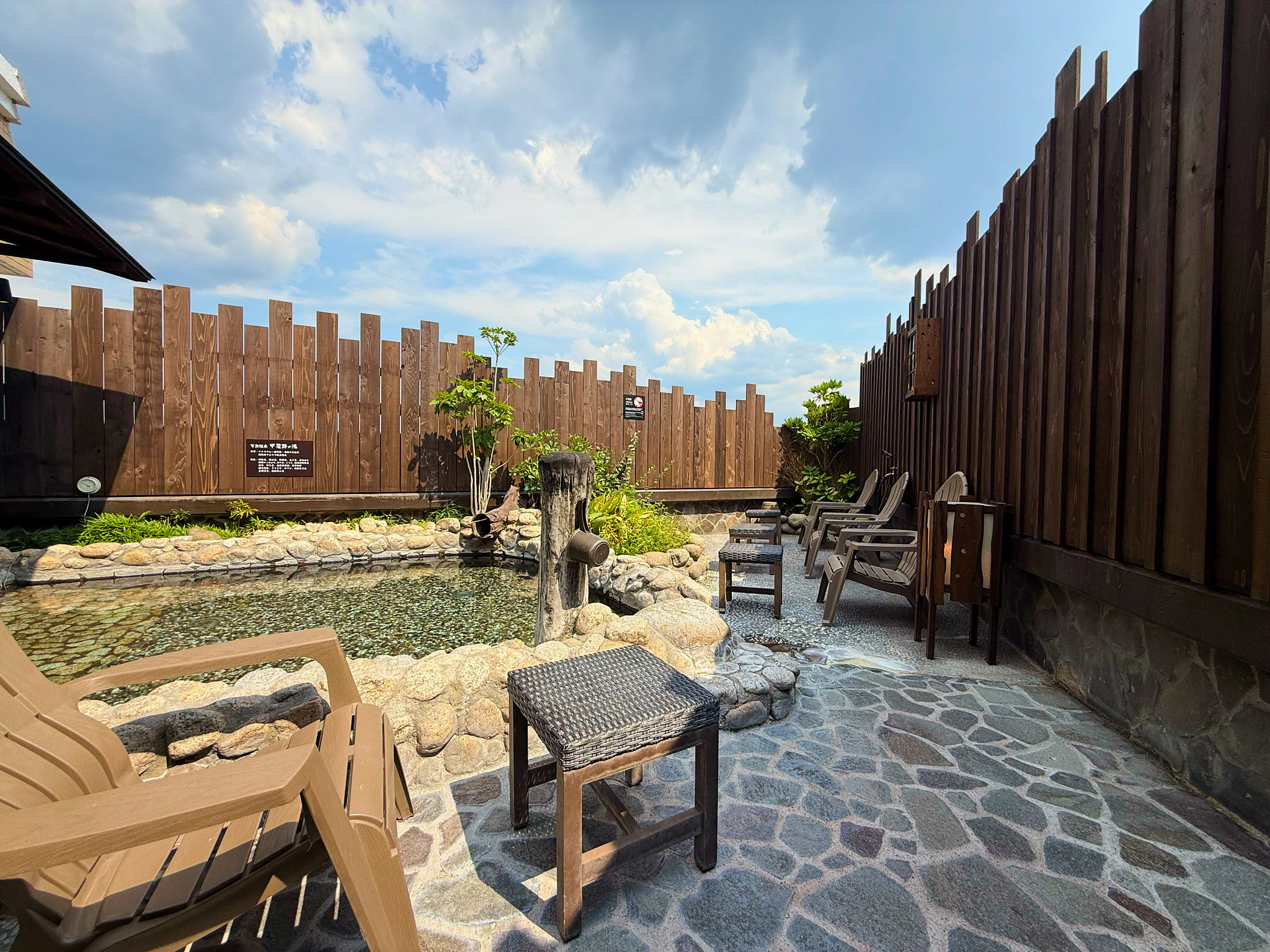 開放感たっぷりの露天風呂には、外気浴用のイスの用意も!