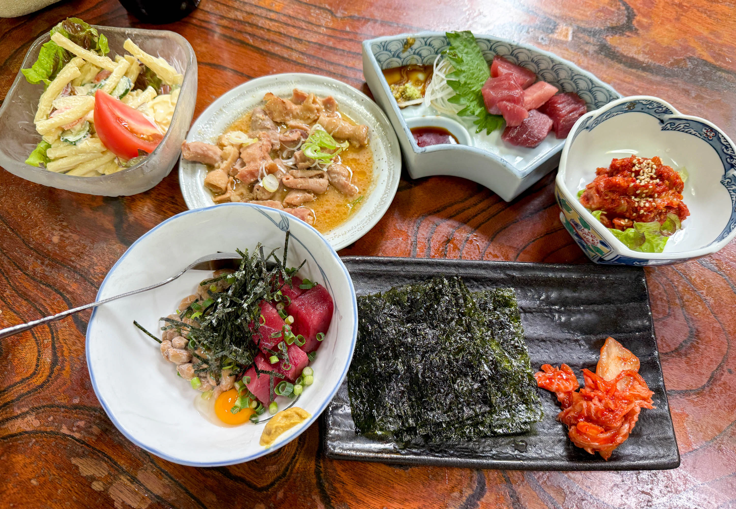壁一面びっしり貼られたメニューから「あれも」「これも」と気になるものを注文した結果、昼の12時とは思えない品数がテーブルに並びました!