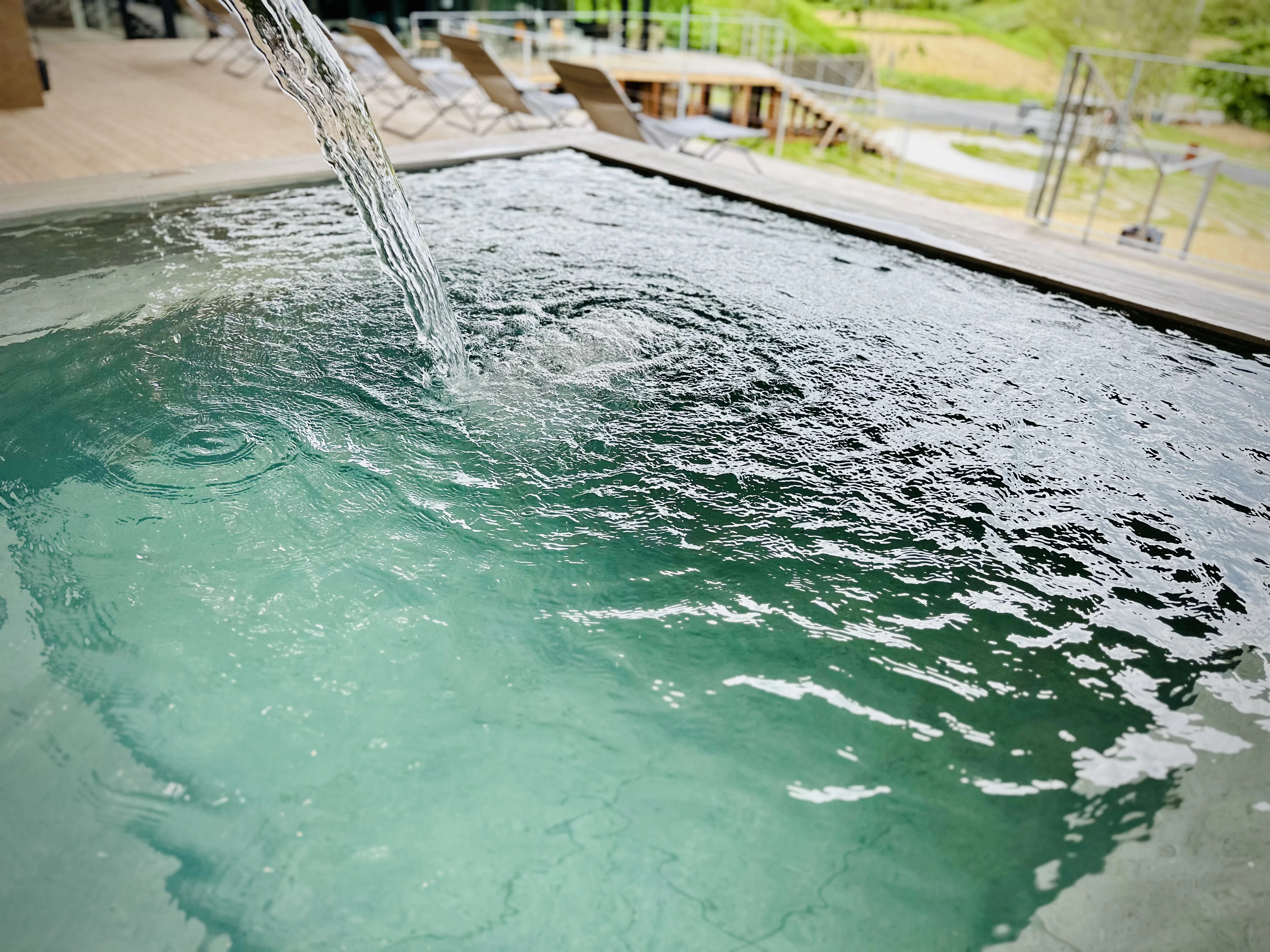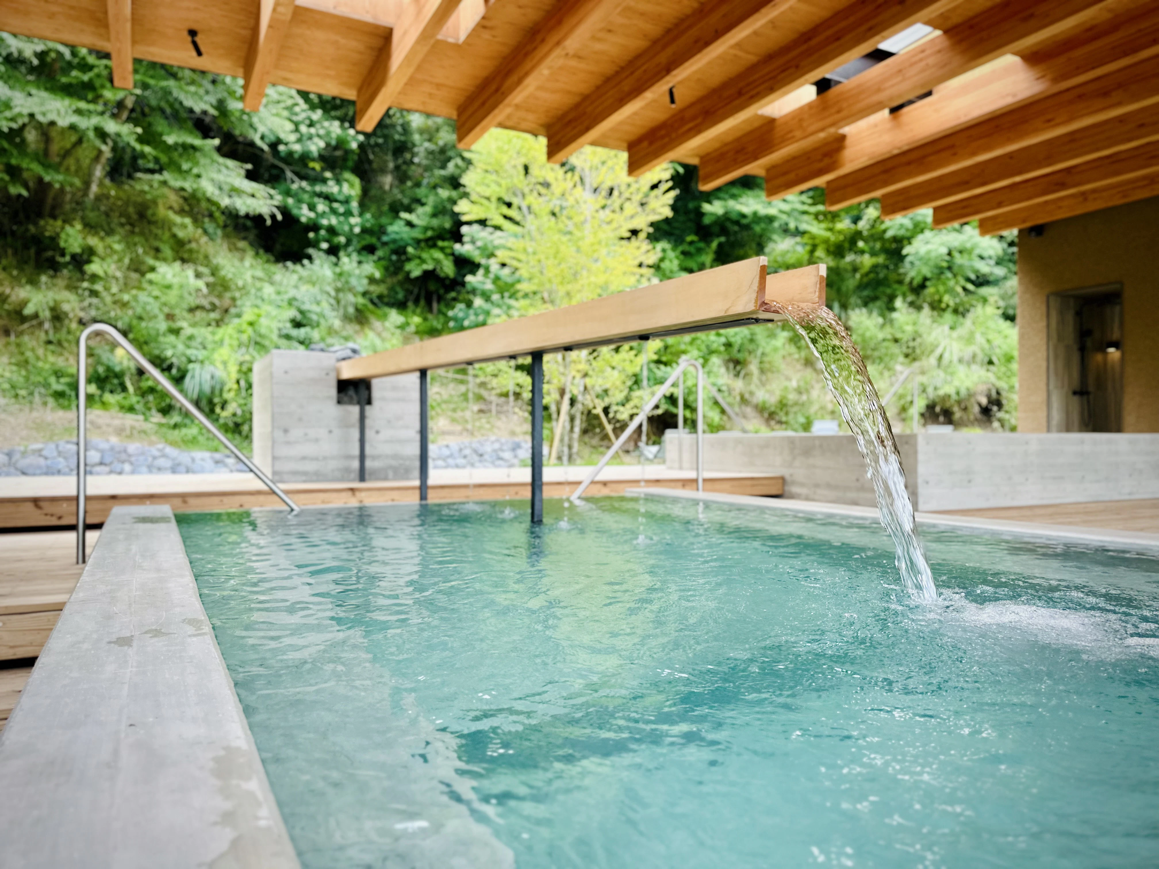 メインの水風呂は深い浴槽に水があふれるほど注がれ、すごい迫力です。