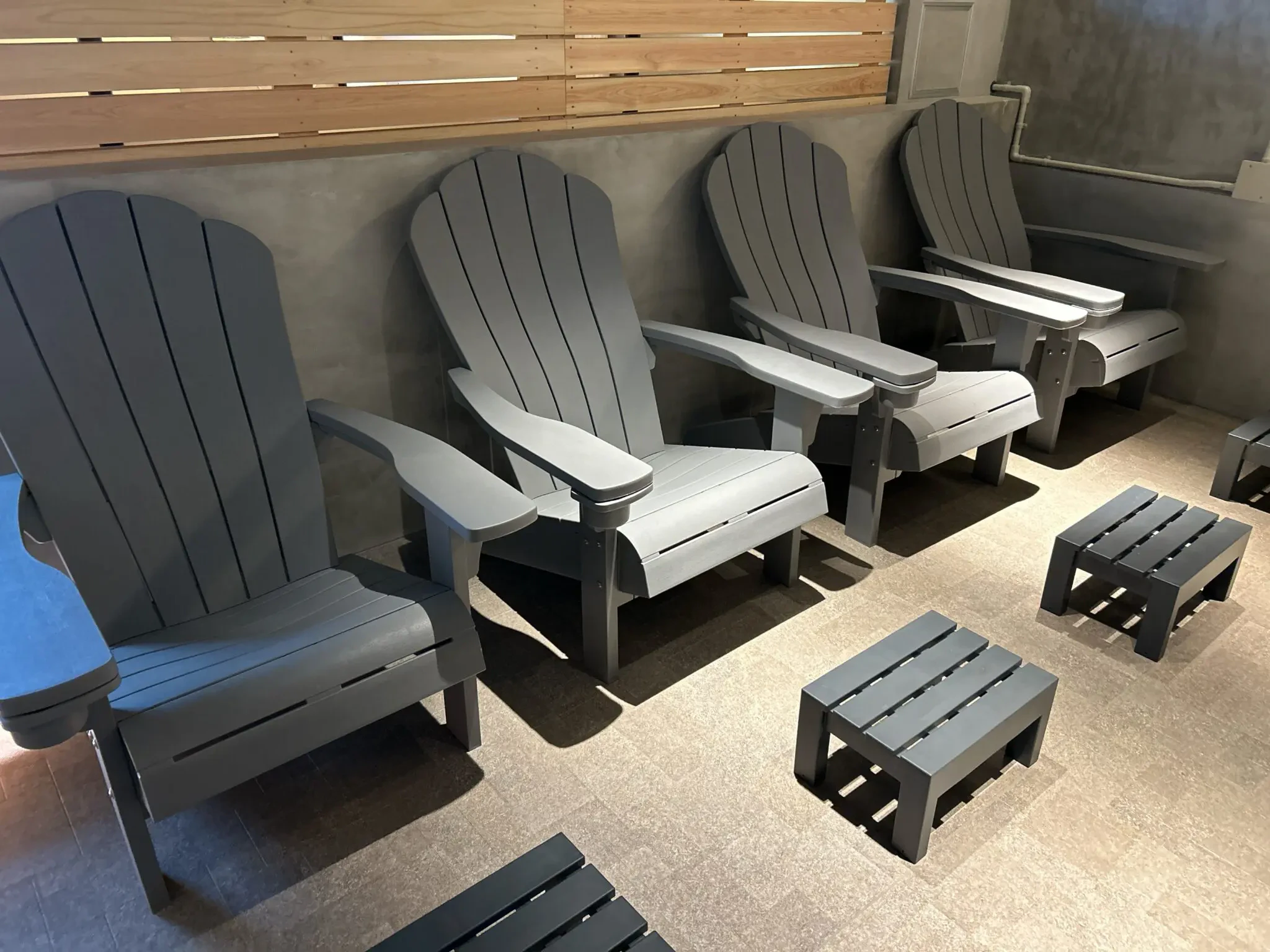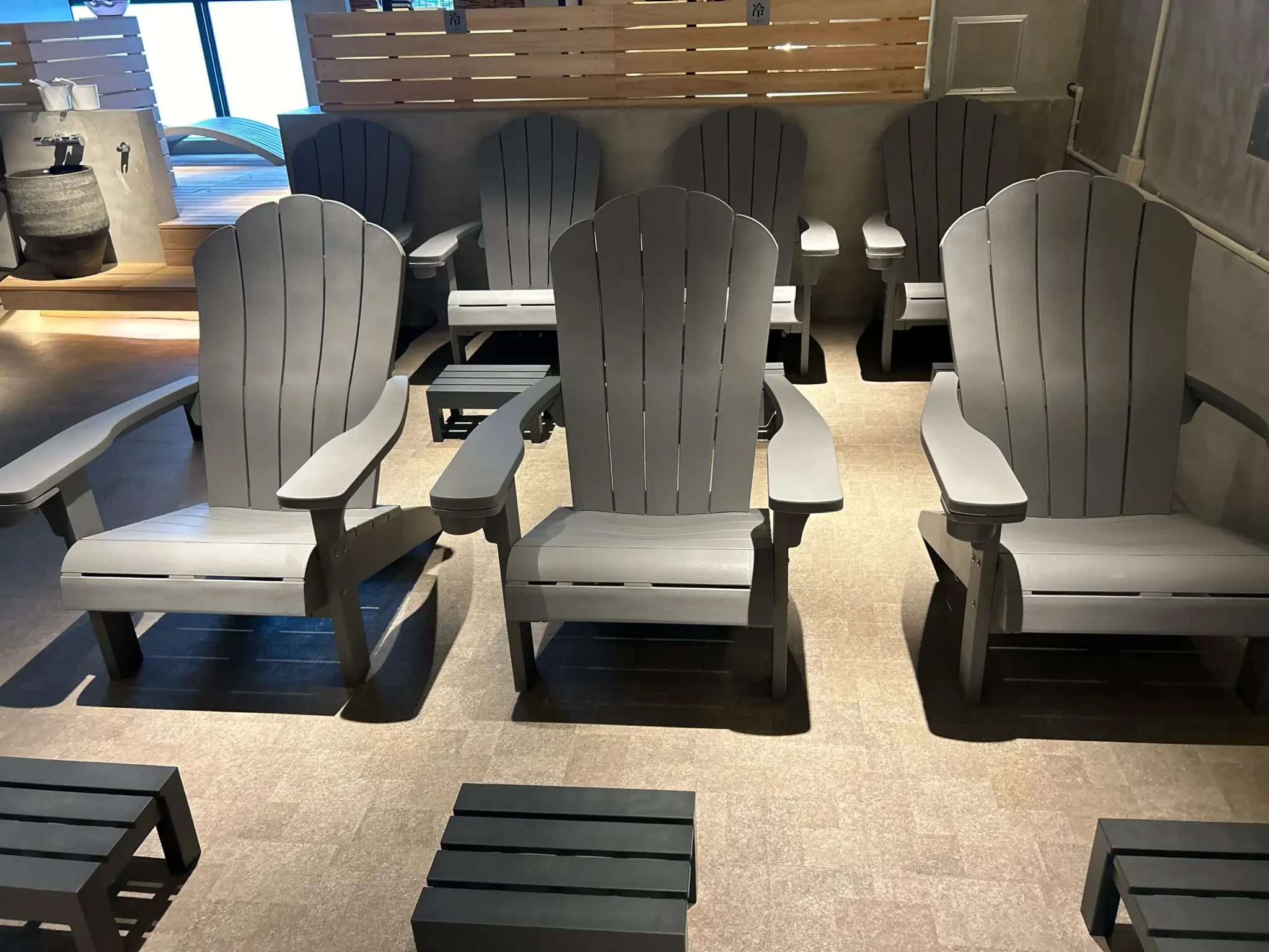 椅子が7脚並んだととのいスペース。火照った体を椅子に委ね、全身の力を抜いて休憩しましょう。空調やサーキュレーターなどが完備されているので、ゆっくりクールダウンできます。