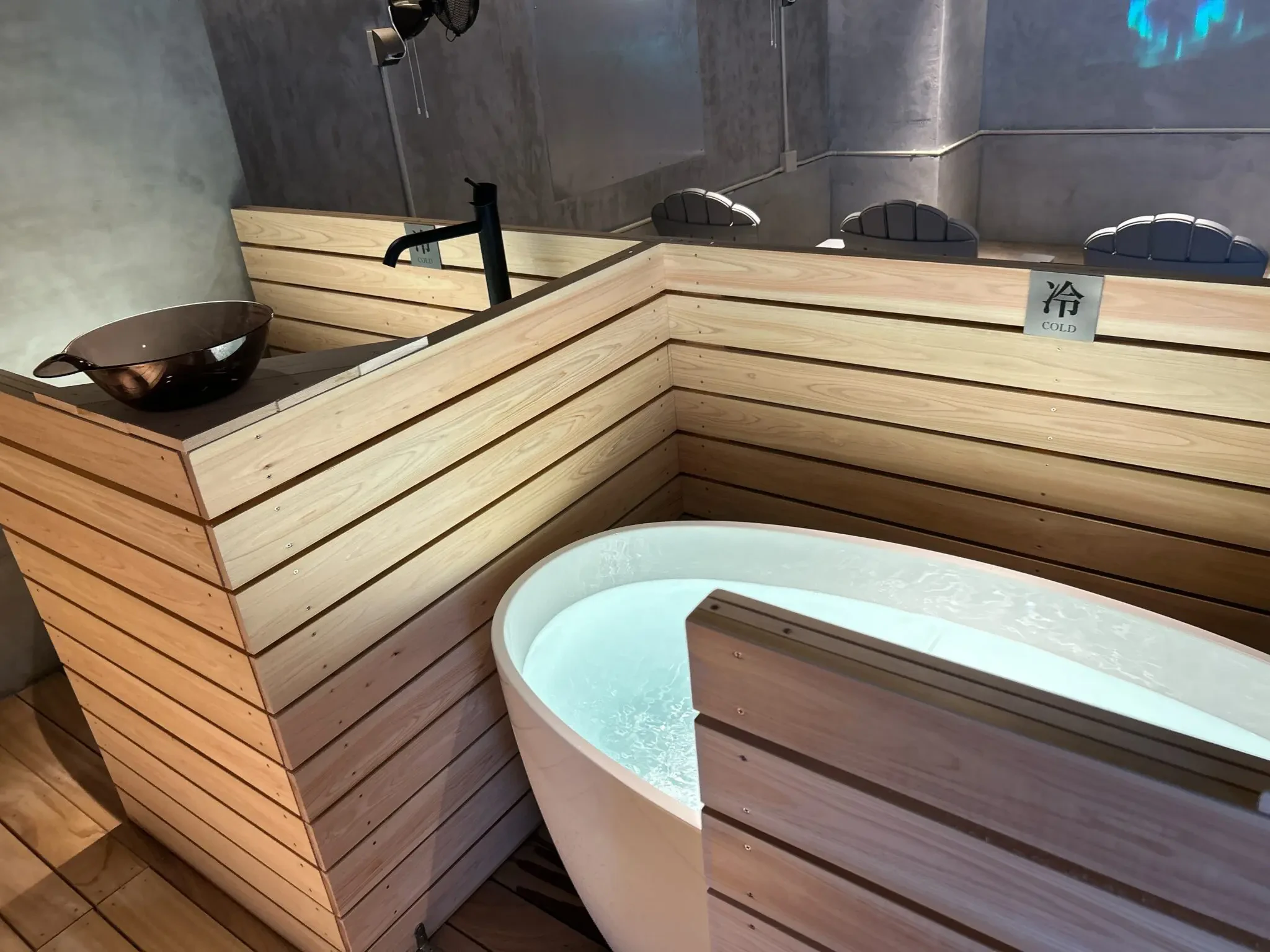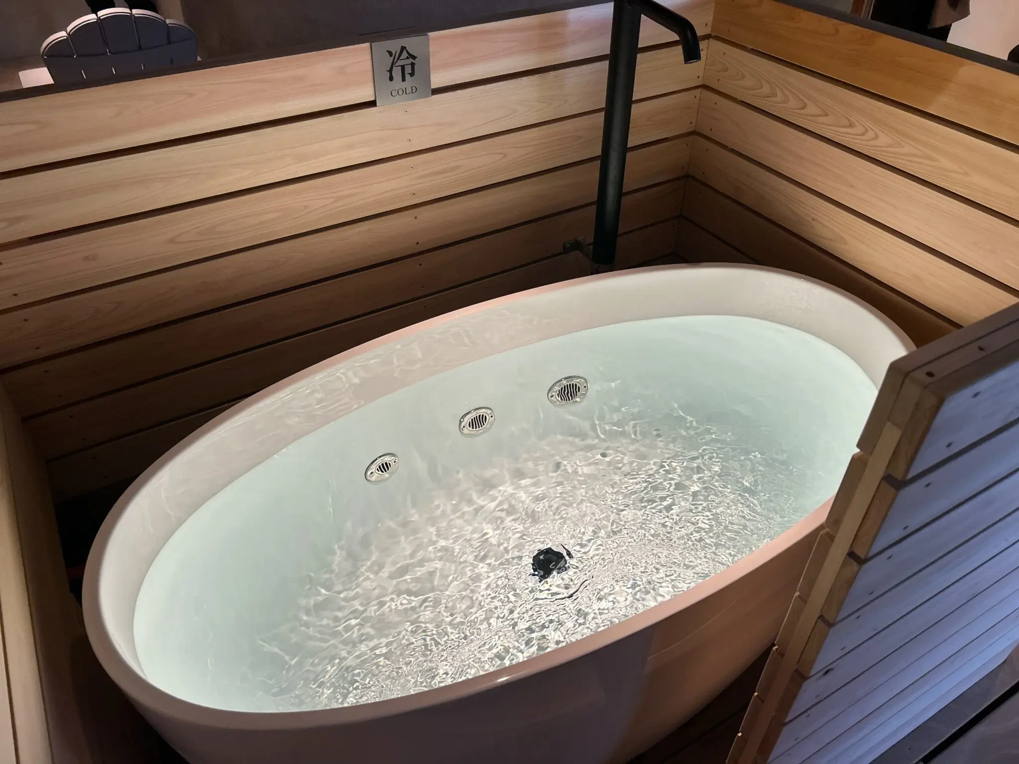 サウナ室を出て少し階段を上ったところに2つの水風呂があります。おひとり様専用の浴槽になっており、水風呂は2つ用意されていました。