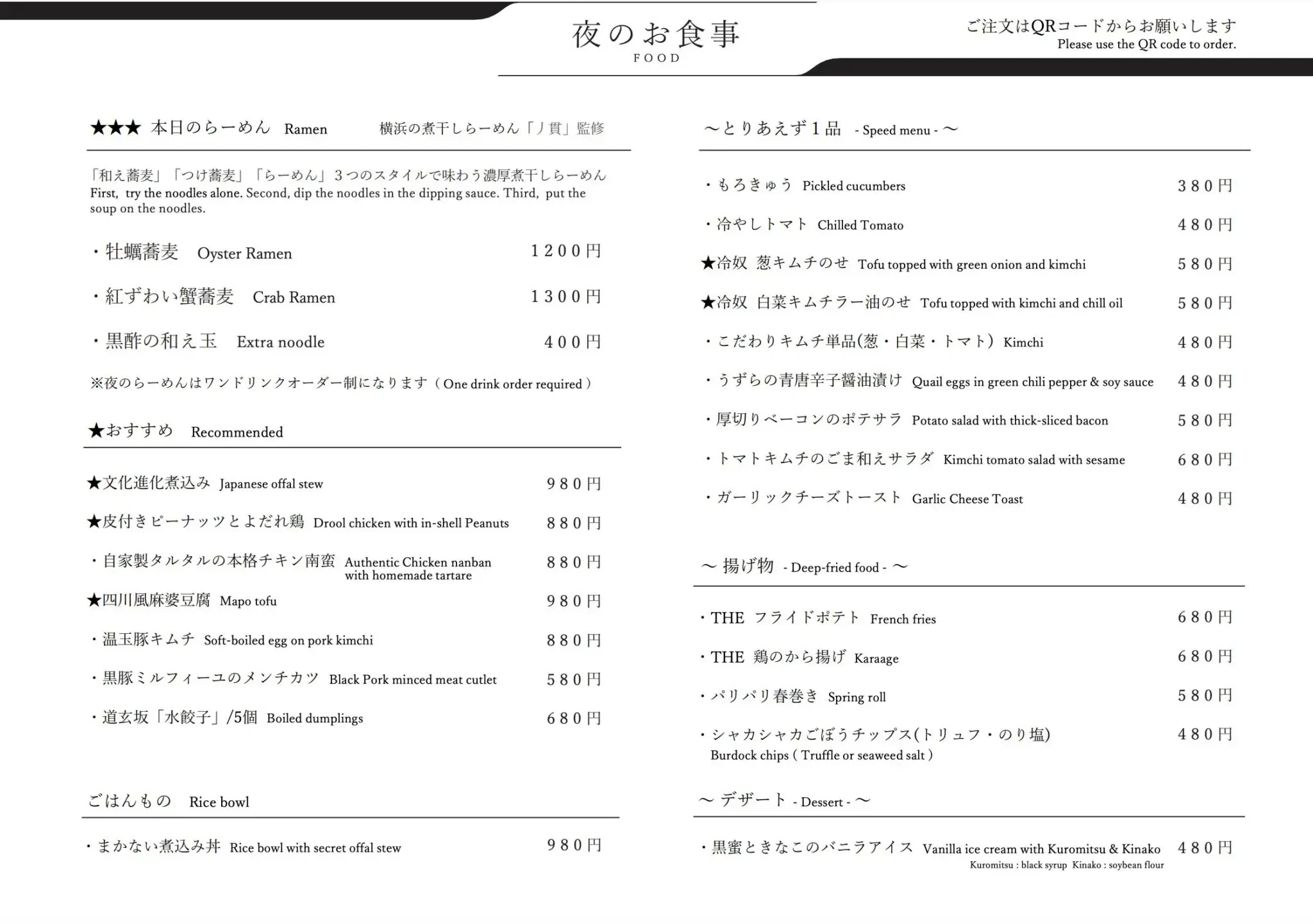 夜の時間帯は、ふらっと入ってふらっと出れる立ち飲み屋として営業。昼とは異なる洗練されたモダンな雰囲気の中でハブ酒やクラフトビールを嗜みながら、自家製のタレが特徴的な煮込みや水餃子などがいただけます。