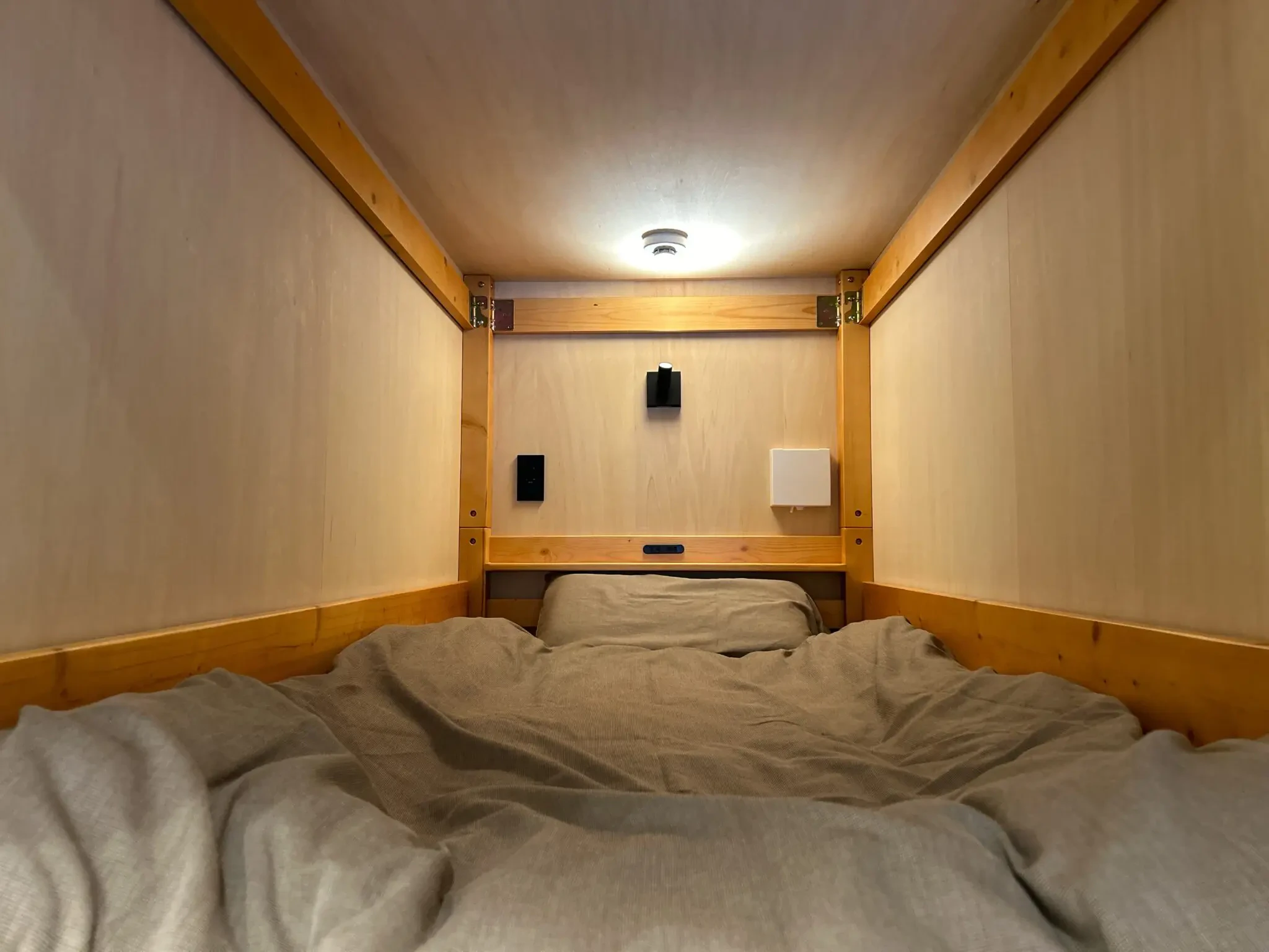 落ち着いた照明が付いているベッド内。天井も高く、ゆったりしているので、窮屈感は全くありません。枕元に電源もあり、スマホも充電などもできるので安心です!