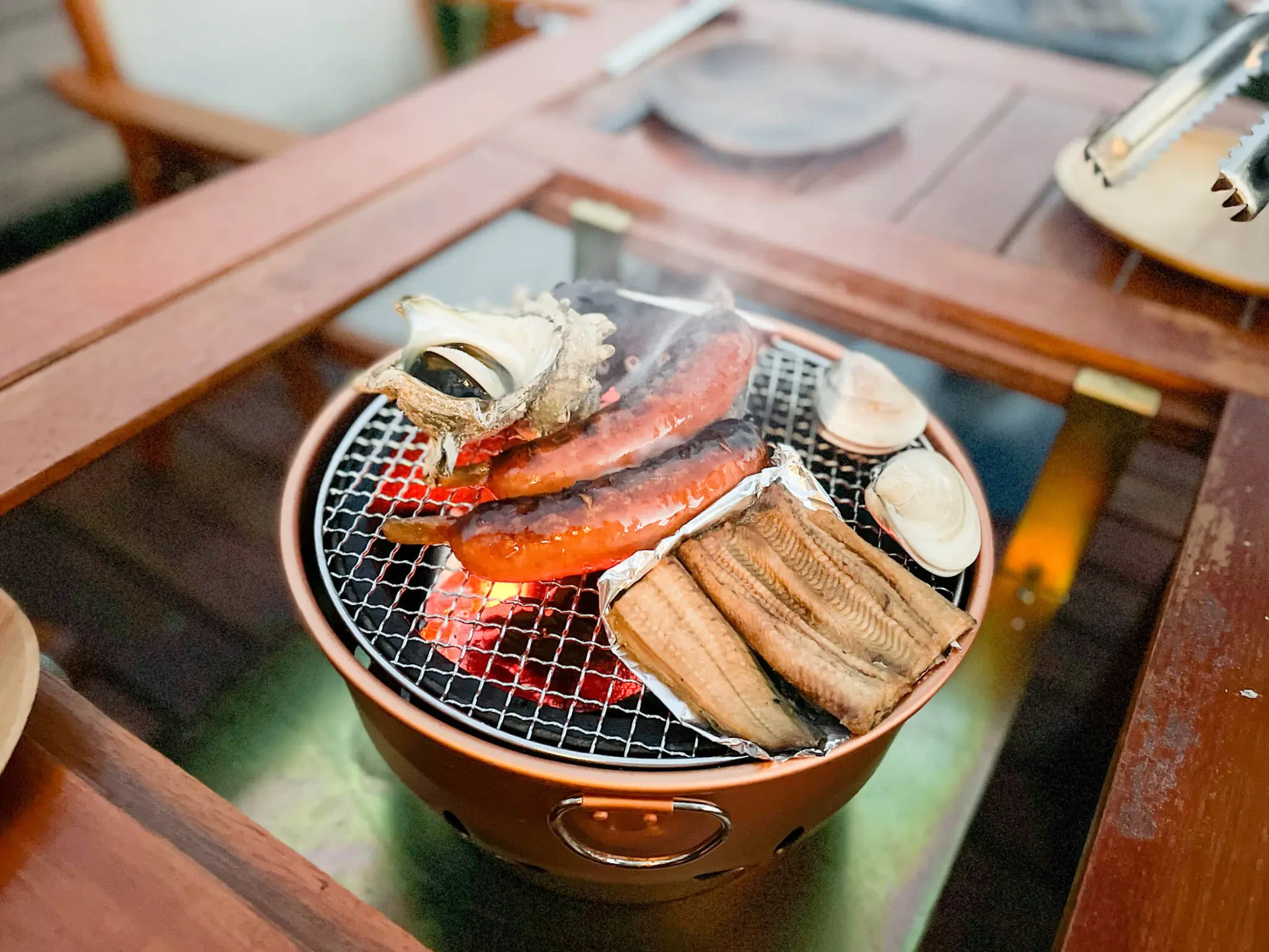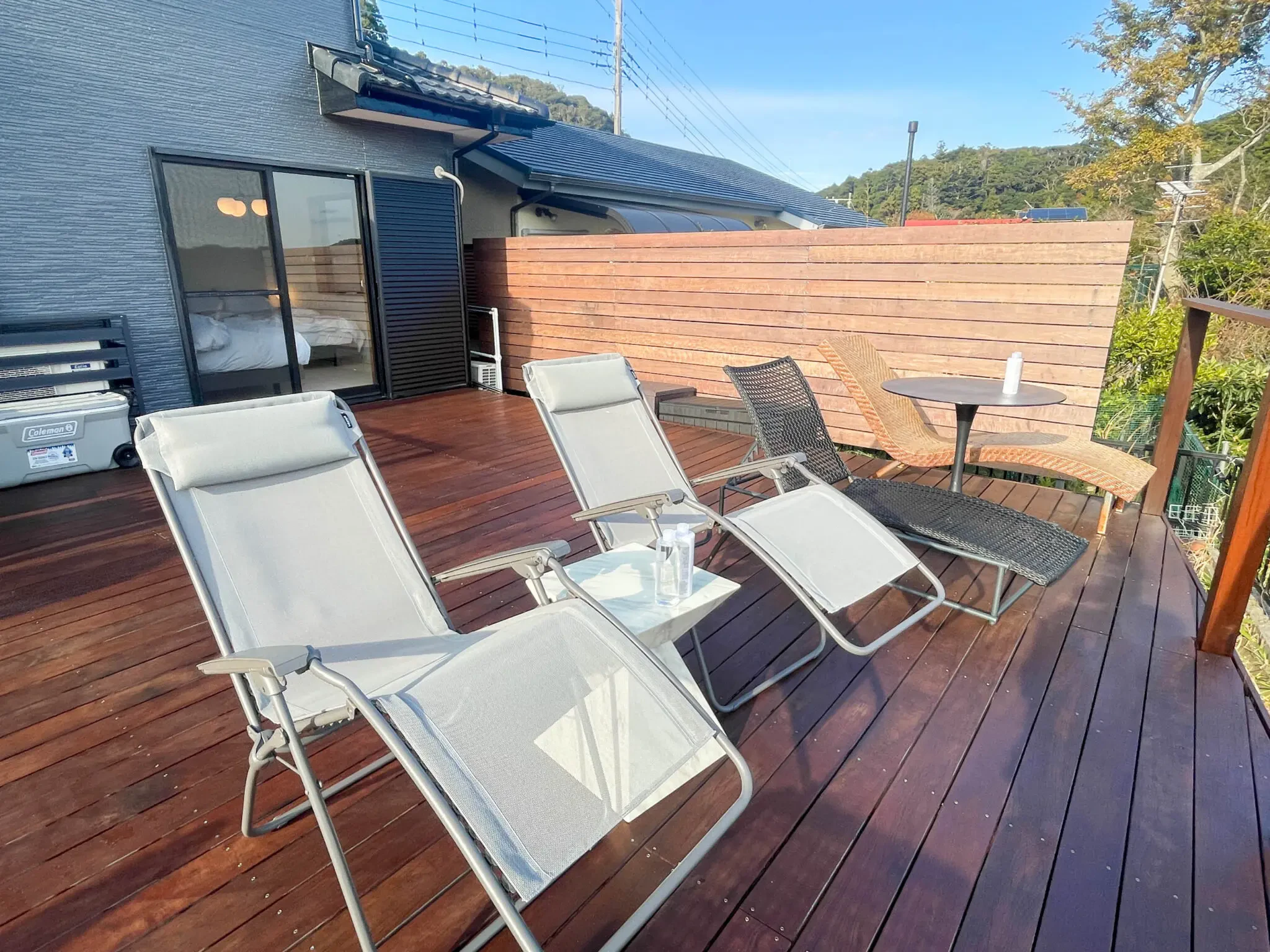 「勝浦の地の食材」をこれでもか!と堪能できるBBQは、ウッドデッキにイスとテーブルを準備して贅沢に。お肉から海鮮まで本当においしかった……。