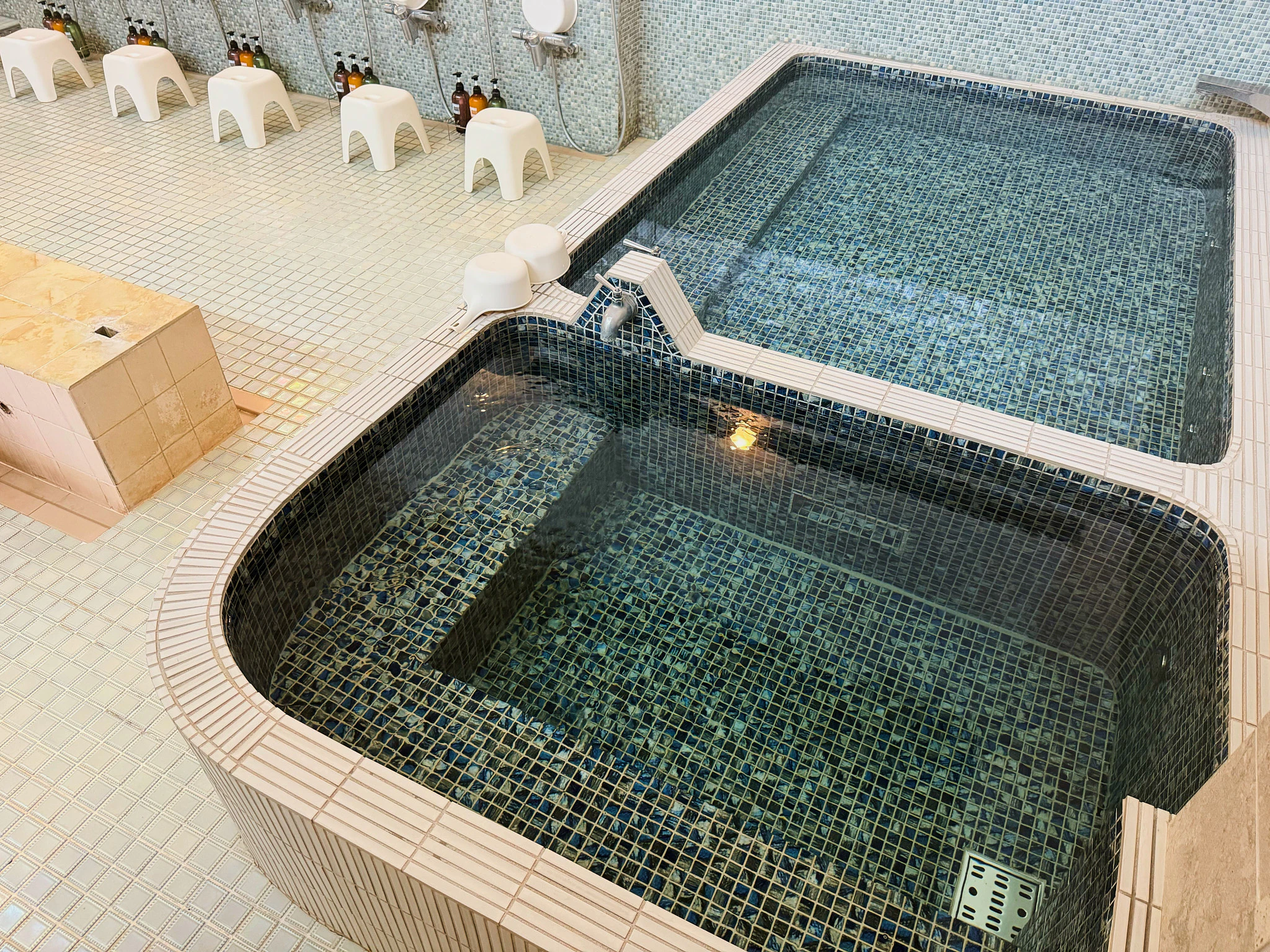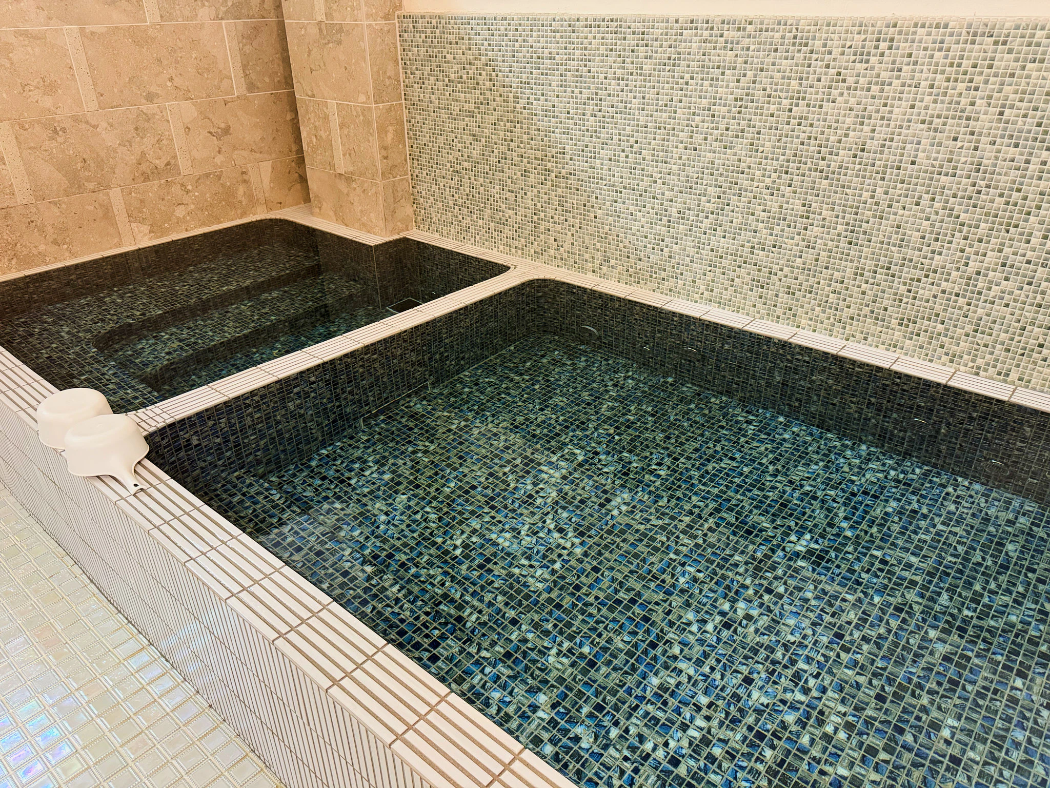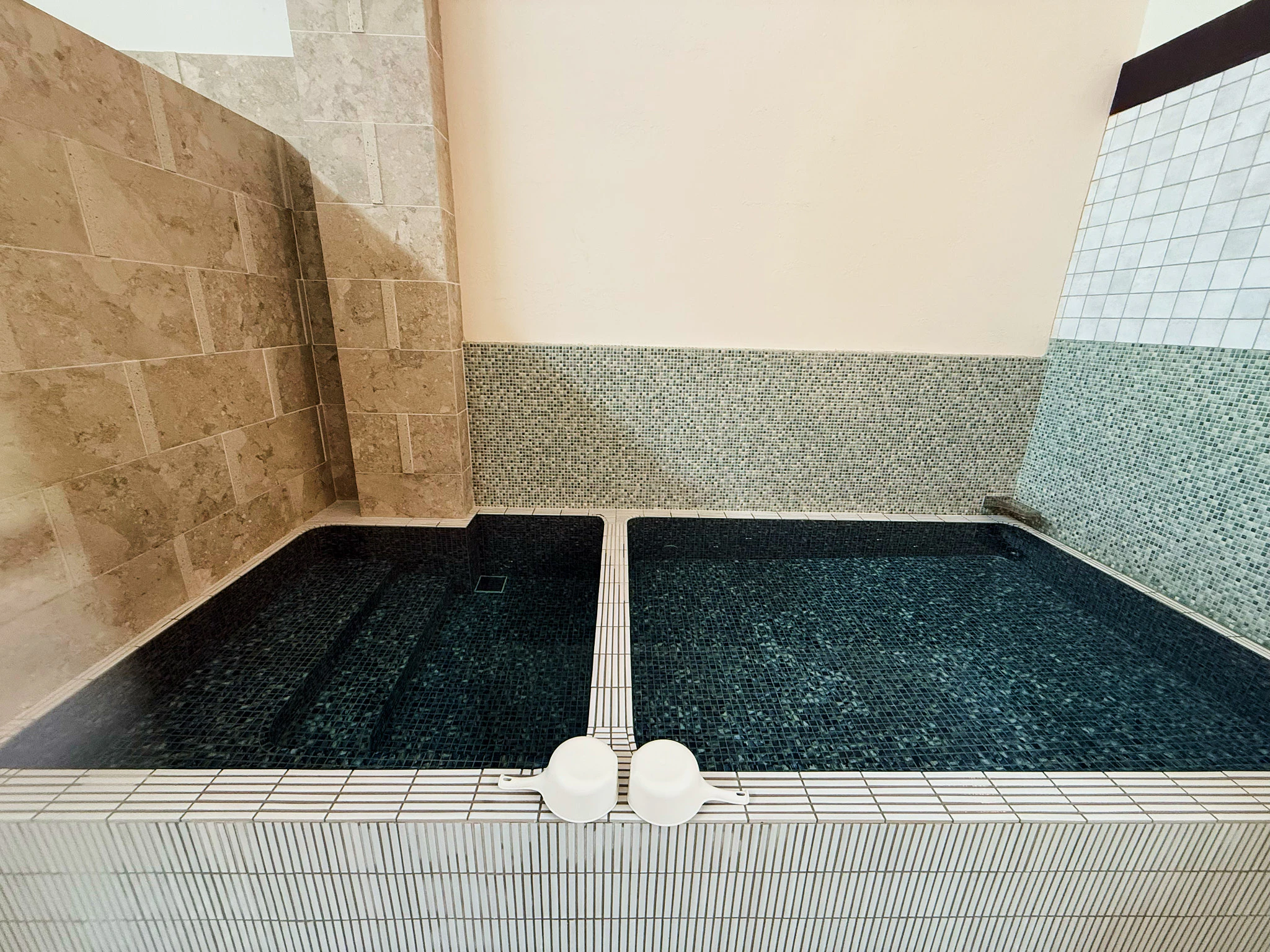 洗い場の奥には白湯もあります。ととのって少し体が冷えたら、こちらに入ってじんわりポカポカ。青く光るタイルの色がきれいで癒されます。