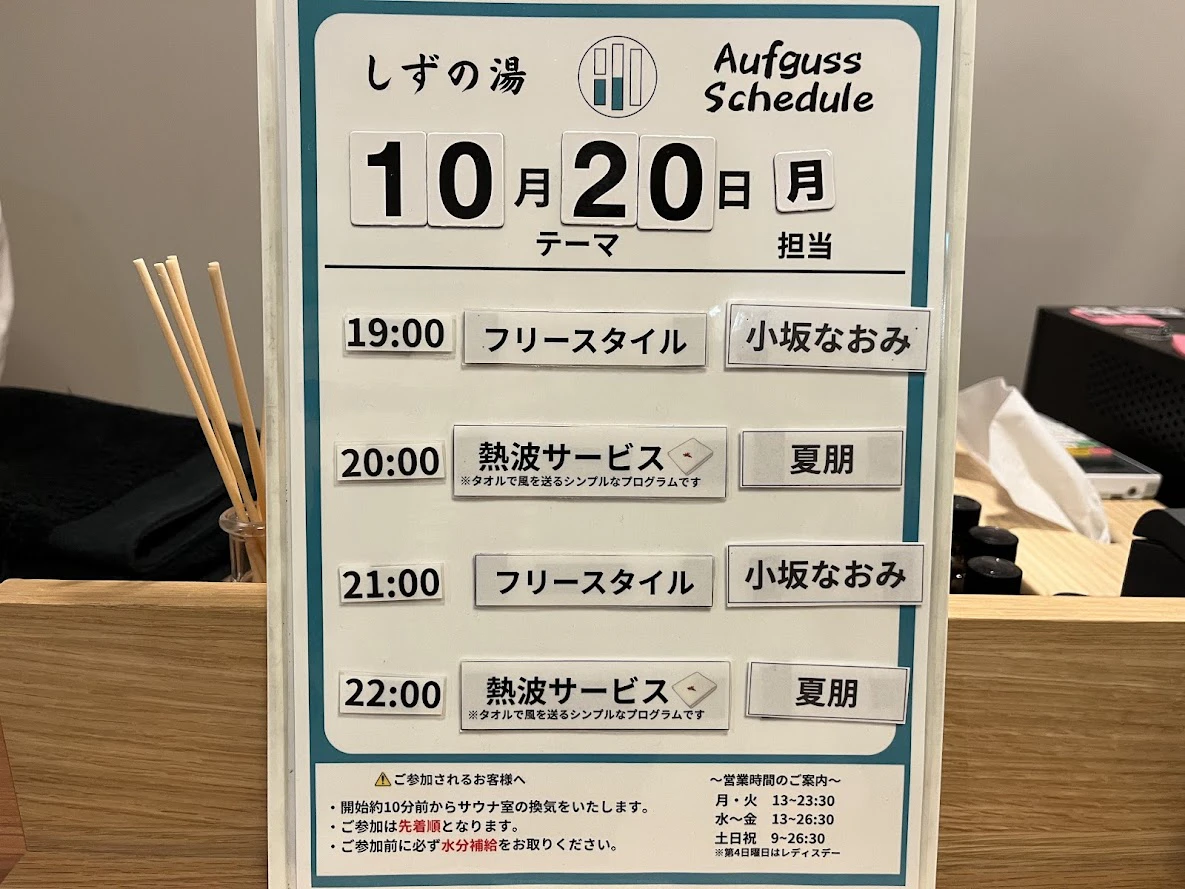 アロマを変えながらたっぷり3セットぶんの風を送ってくれ、最後は拍手で終了。小坂さんは、しずの湯のレディースデイは毎回アウフグースを担当しているそうです。気になる方はぜひ、南国風アウフグースをご堪能ください。