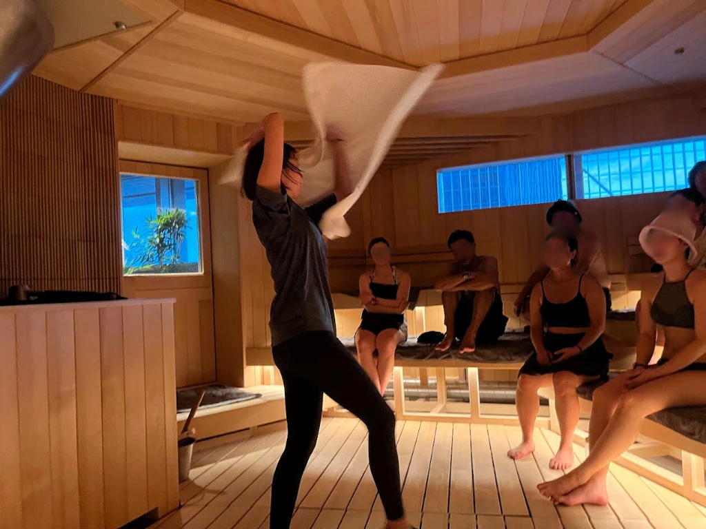 こちらではスクラブリトリートに参加しました。まずは、大きめの扇子を使ったロウリュ。やさしく風を送ってくれるので、じわじわ温まります。