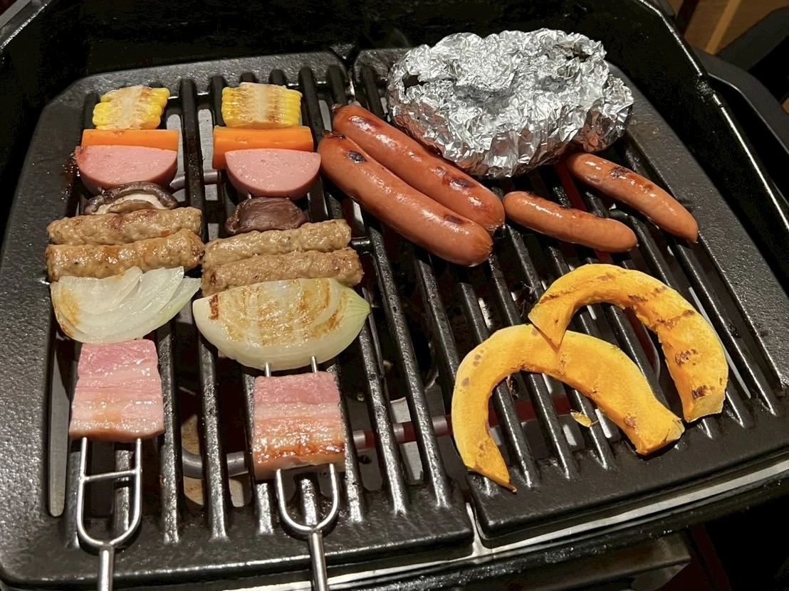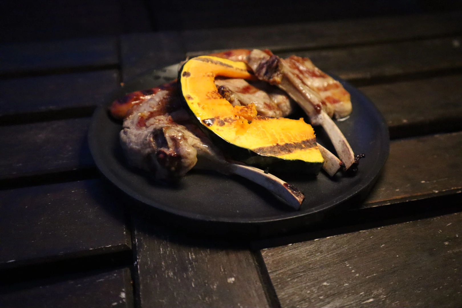 夕飯はウッドデッキにある電気グリルでのBBQと、具沢山で温めるだけのミネストローネやキーマカレーがセットになっていました。巨大なTボーンワイルドステーキと野菜やベーコンが入った串を焼いていきます。お肉やソーセージはやわらかく、お酒がどんどん進む濃いめの味付けでした。