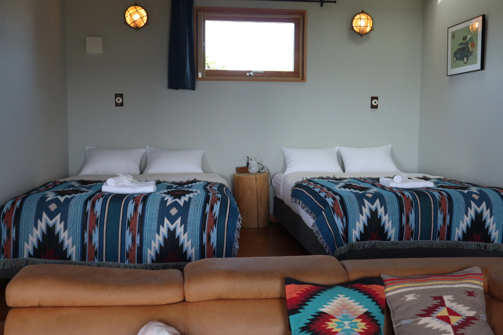 管理所で受付を済ませて、いよいよグランピングコテージへ!今回はガレージ付きのコテージに宿泊しました。車を室内の隣まで入れられるので、移動も楽チンで雨の日でも安心です。部屋の家具や照明は、ヴィンテージ感が漂うおしゃれな雰囲気。