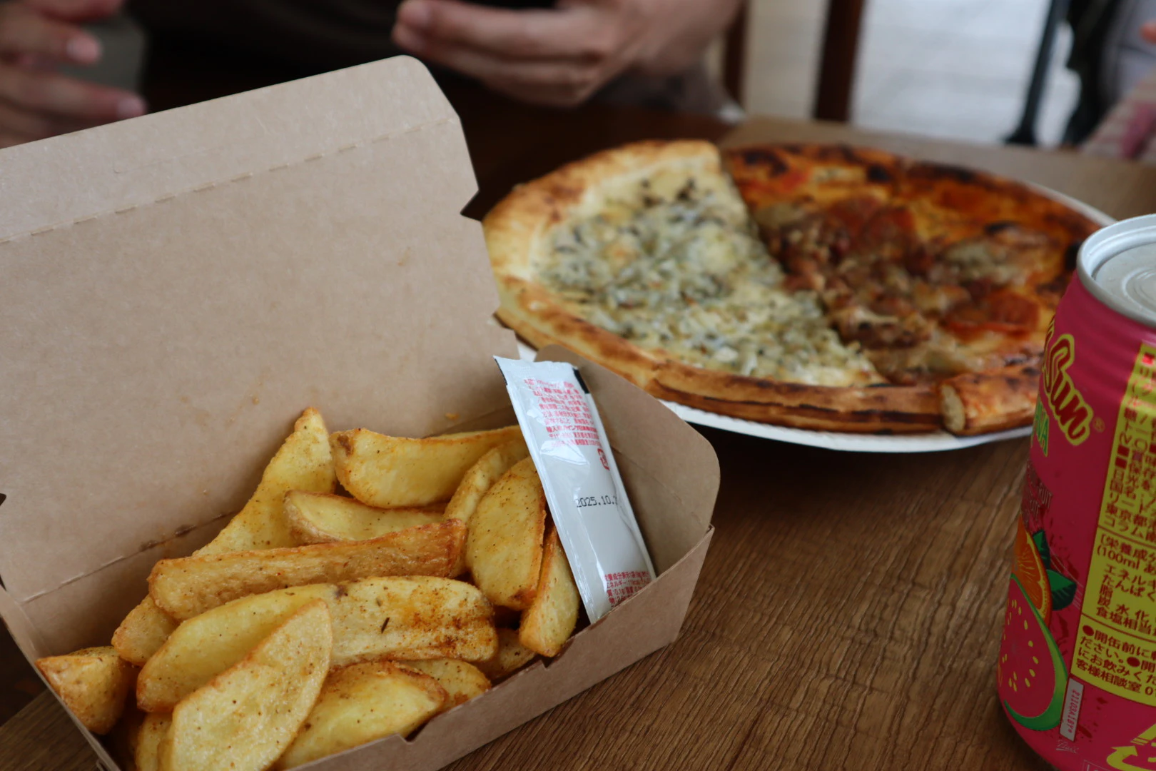昼食は園内の「PIZZA IN THE SUN」で、湘南しらすピザとトマトベースのA.T.G.Oというお店の看板ピザを食べました。平日限定のハーフサイズ2つにしましたが、生地が薄焼きでぺろっと食べれたので、通常サイズでもよかったかも。
