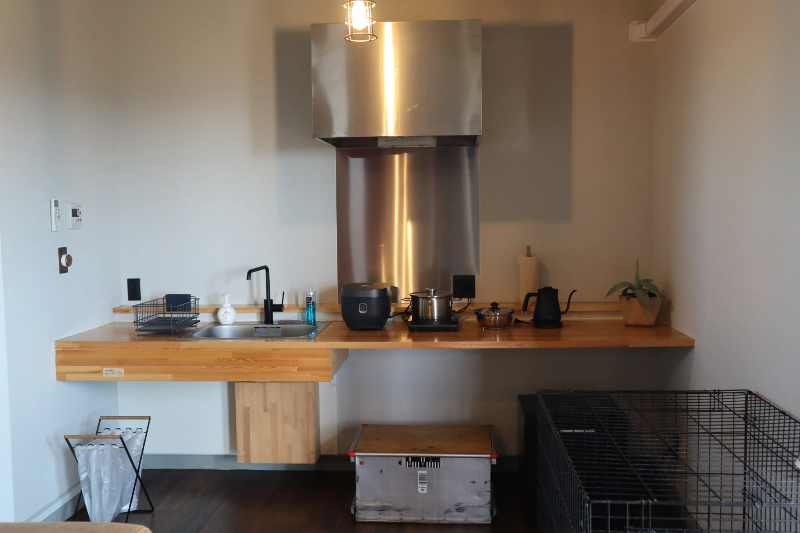 小上がり部分に寝室が設置されていて、シャワールームやトイレ、キッチンも完備されています。この棟のみペットOKなので、ゲージも用意されていました。