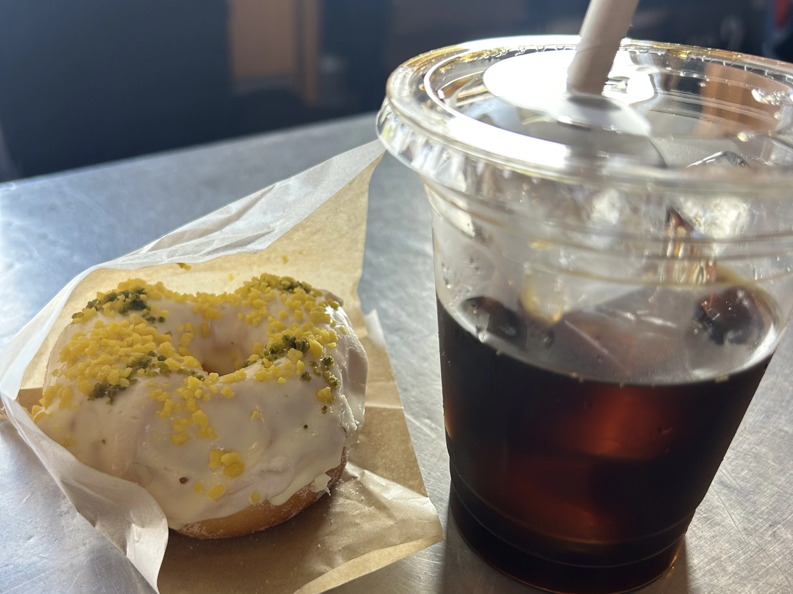 ドーナッツは定番メニューの「イチゴミルクチョコ」と春限定の「はちみつレモンmimosa」をチョイス。上のチョコレート部分は結構甘みが強く、レモンピールがとても爽やかで、ブレンドコーヒーとの相性抜群でした。