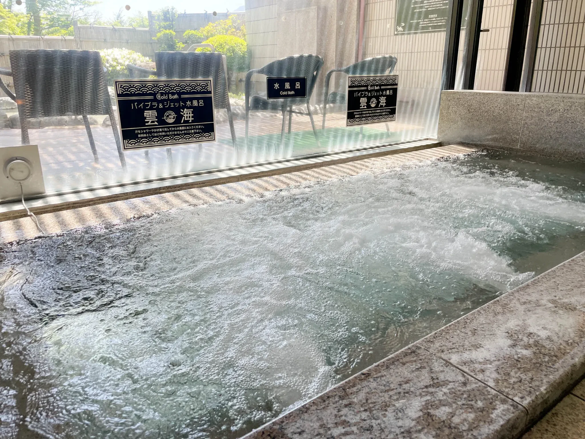 サウナ後は、ぜひ富士山の天然水を贅沢に使用した「飲める水風呂」へ。バイブラとジェットの効いた新感覚水風呂「雲海」も必見です。