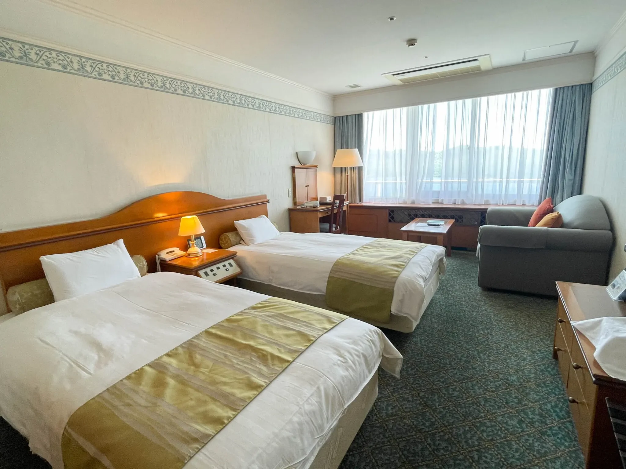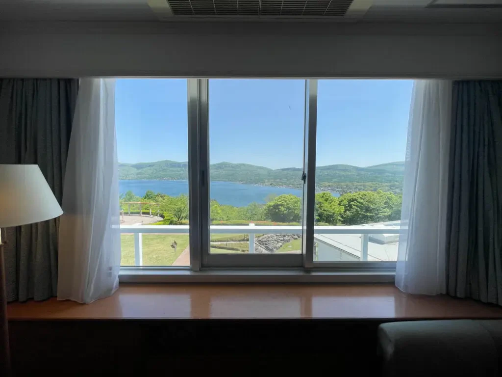 ゆったりくつろげる「スタンダードツイン」は、山中湖を一望できる客室タイプ。窓の右手からは富士山を見ることもできます。