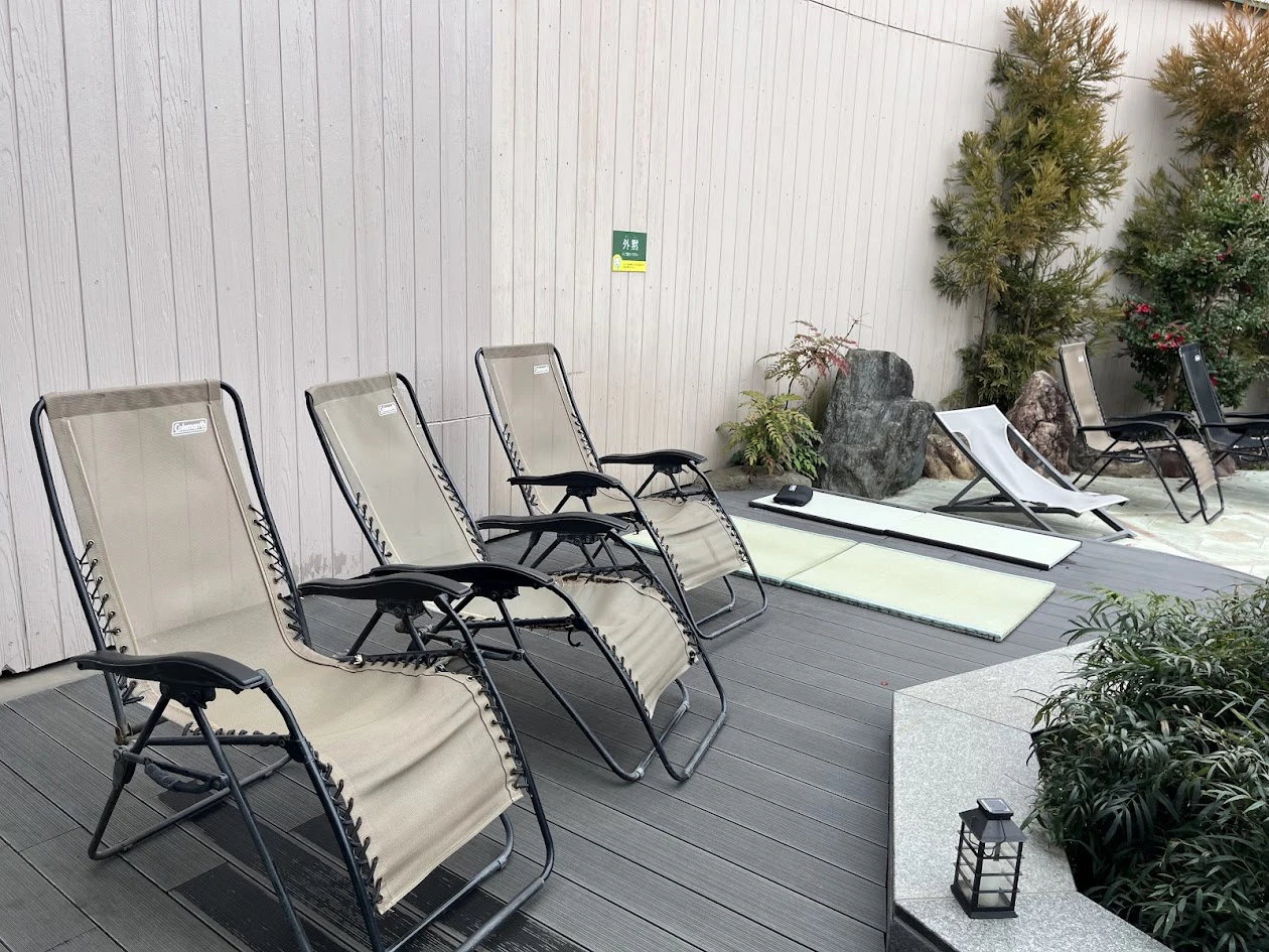 浴場と露天スペースには、ととのいイスがこれでもか!というくらい置かれています。イスだけでなく畳で横になれるところもあり、お好みの体勢でととのえます。