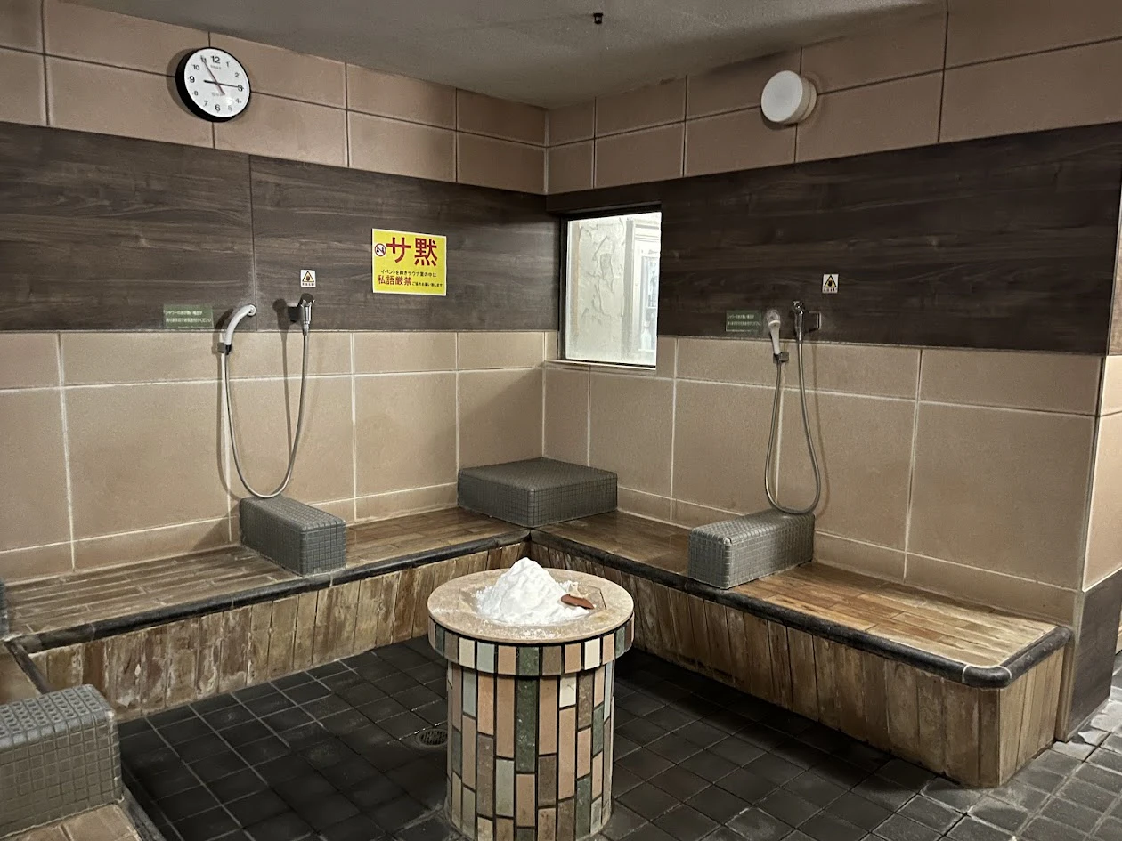 タワーサウナの横にあるのが塩サウナです。広々とした空間の中央に塩が用意されていて、体に塗りながらじっくりと発汗できます。マイルドなサウナ室でじんわり蒸されたいときにおすすめです。