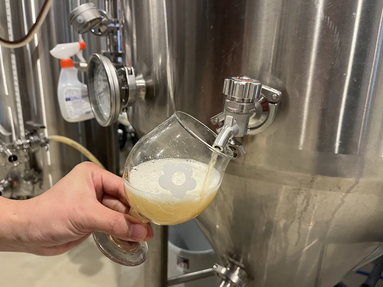 取材時には、醸造中のビールを特別に試飲させていただきました。まだ2週間ほど醸造を続けるとのことで、これから色が透き通り、味が引き締まっていくそう。